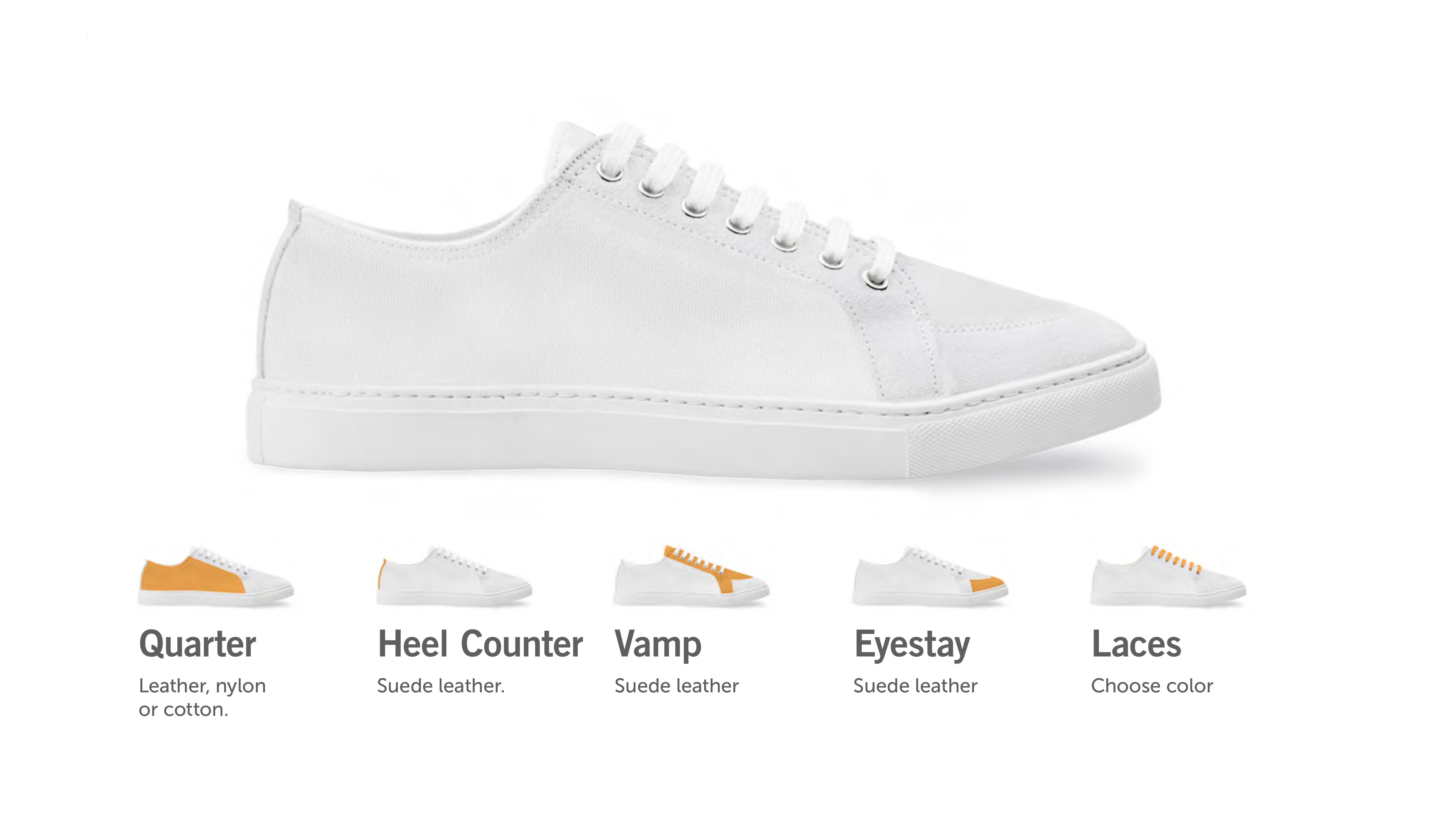 Klassiska låga sneakers med egen design. Bygg din egen sko genom att välja material och färg på hela skon eller på detaljer som bl.a. plös och häl. Du får också välja märkningsmetod och färg på skosnören. Skorna är producerade i Spanien. Möjlighet till skokartong med eget tryck. Beställ klassiska låga sneakers med egen design.