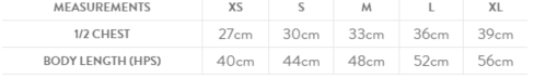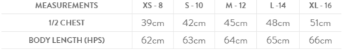 - Dam: XS (8), S (10), M (12), L (14), XL (16)