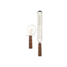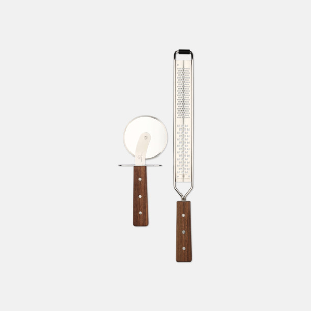 Ett elegant och funktionellt pizzaset från Catarina König, tillverkat i hållbart rostfritt stål med handtag av vackert valnötsträ. Setet innehåller en vass pizzaskärare och ett mångsidigt rivjärn med dubbla ytor. En grov sida för snabb rivning av hårdost eller choklad, och en fin sida för mycket finfördelat resultat, till exempel muskot eller parmesan. Levereras i en stilfull presentförpackning, vilket gör det perfekt både som profilprodukt och som gåva till det egna köket.