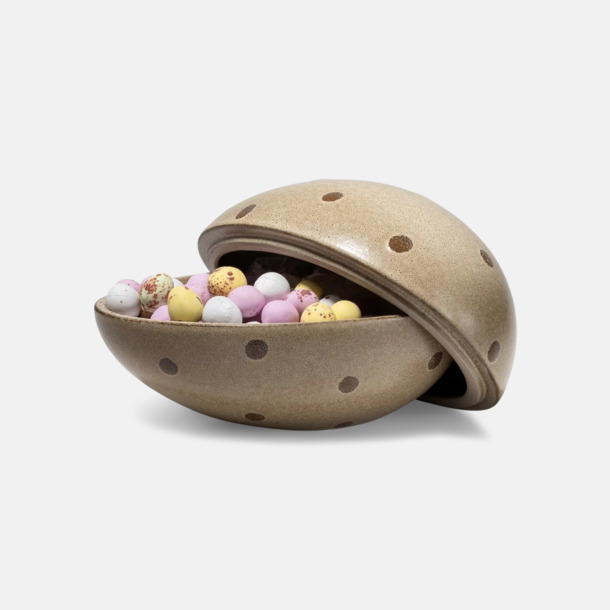 Påskägg keramik från DBKD är både en stilfull godisbehållare och en vacker inredningsdetalj. Ägget fylls med krämiga nougatägg, mjölkchokladägg med krispigt sockerskal eller våra populära favoritmixar. Som tillval kan du lägga till ett personligt påskkort eller en banderoll med egen hälsning, antingen med färdiga påskmotiv eller helt enligt dina önskemål.