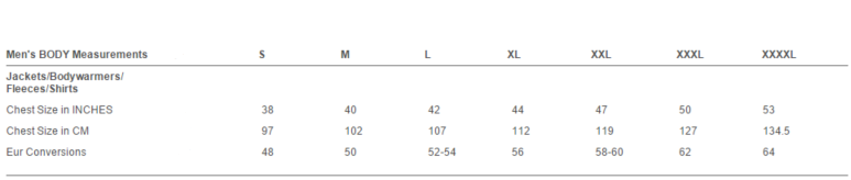 - Herr: S (37/38), M (39/40), L (41/42), XL (43/44), XXL (46/48), 3XL (49/51), (endast svart och marinblå: 4XL (52/54), 5XL (55/57))