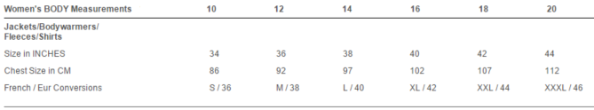 - Dam: 36 (10), 38 (12), 40 (14), 42 (16), 44 (18), 46 (20)